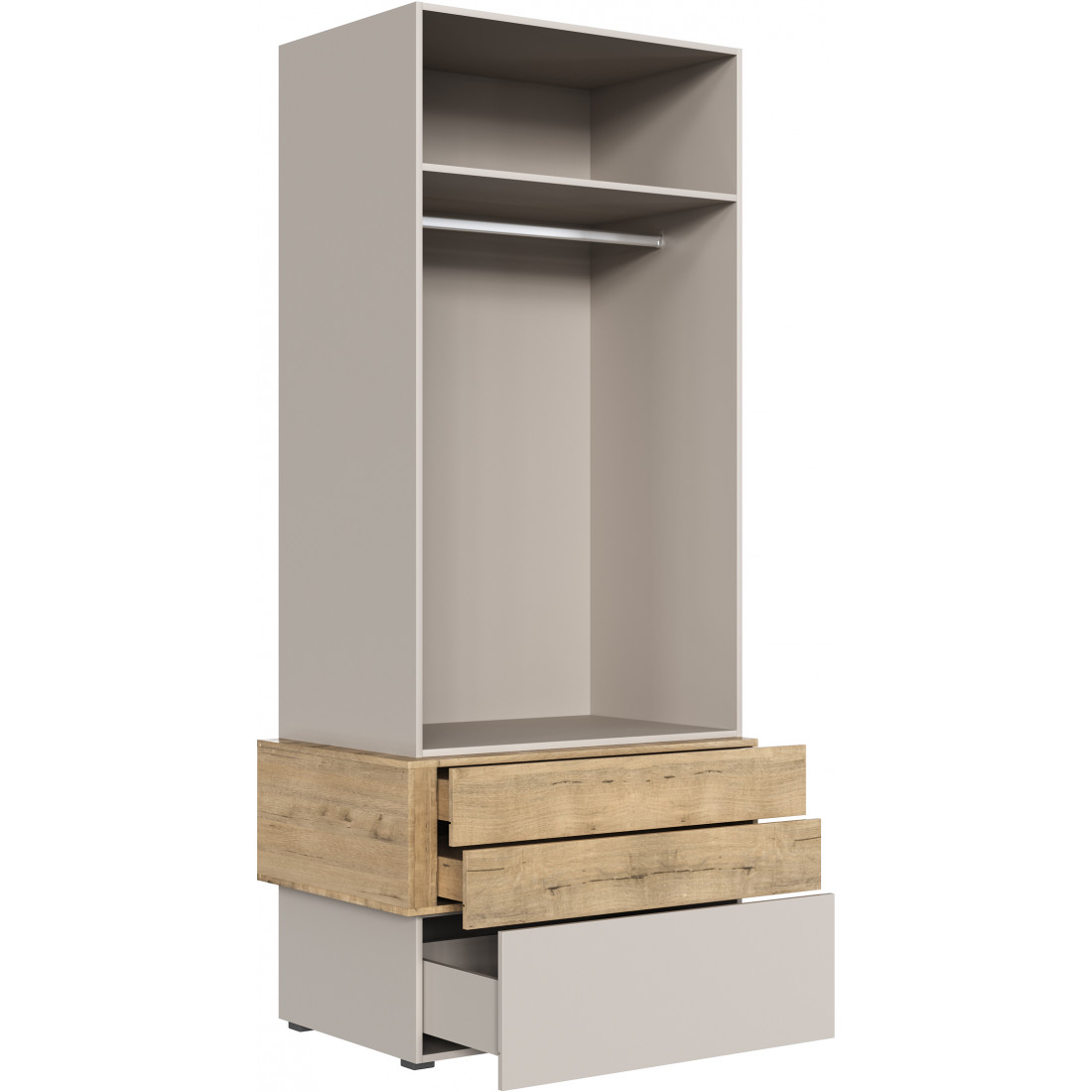 • Шкаф двухстворчатый, укомплектованный полкой, штангой и 3-мя выдвижными ящиками;