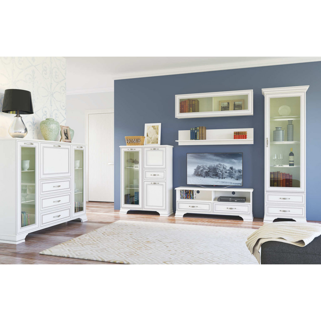 Гостиная Тиффани - это классика, которая всегда остается модной и стильной. Сочетание светлого оттенка с древесной структурой, нежных фасадов, обрамленных изящными планками с патиной и качественных металлических ручек создадут атмосферу тепла и уюта, а возможность использования подсветки делает эту коллекцию особенно привлекательной. Основное достоинство TIFFANY - эстетическая функциональность, которая роскошно дополнит различный по назначению интерьер.