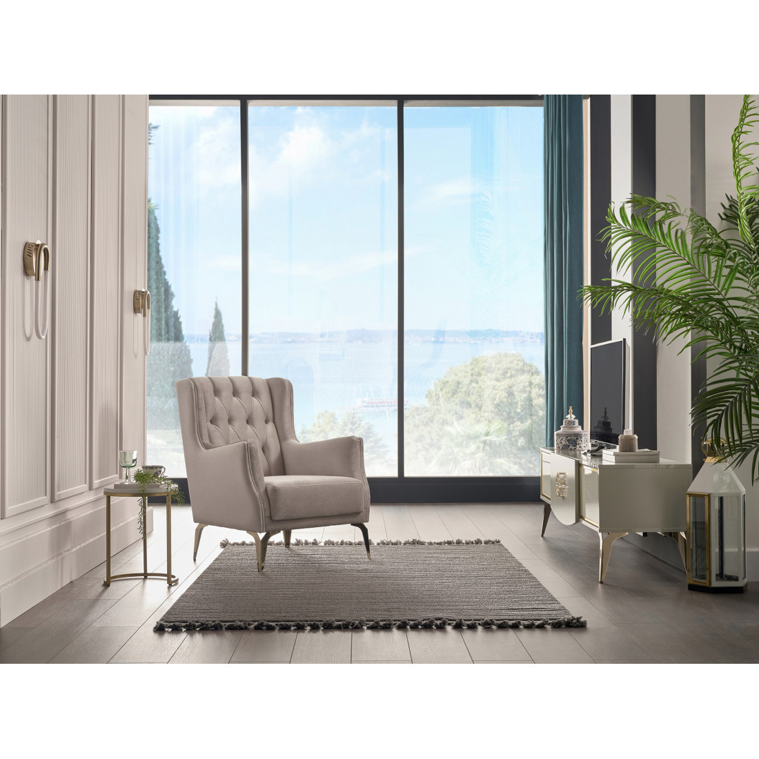 У новинки, на спинке и боковинах присутствует ручная каретная стяжка, придавая ей богатый и благородный внешний вид.